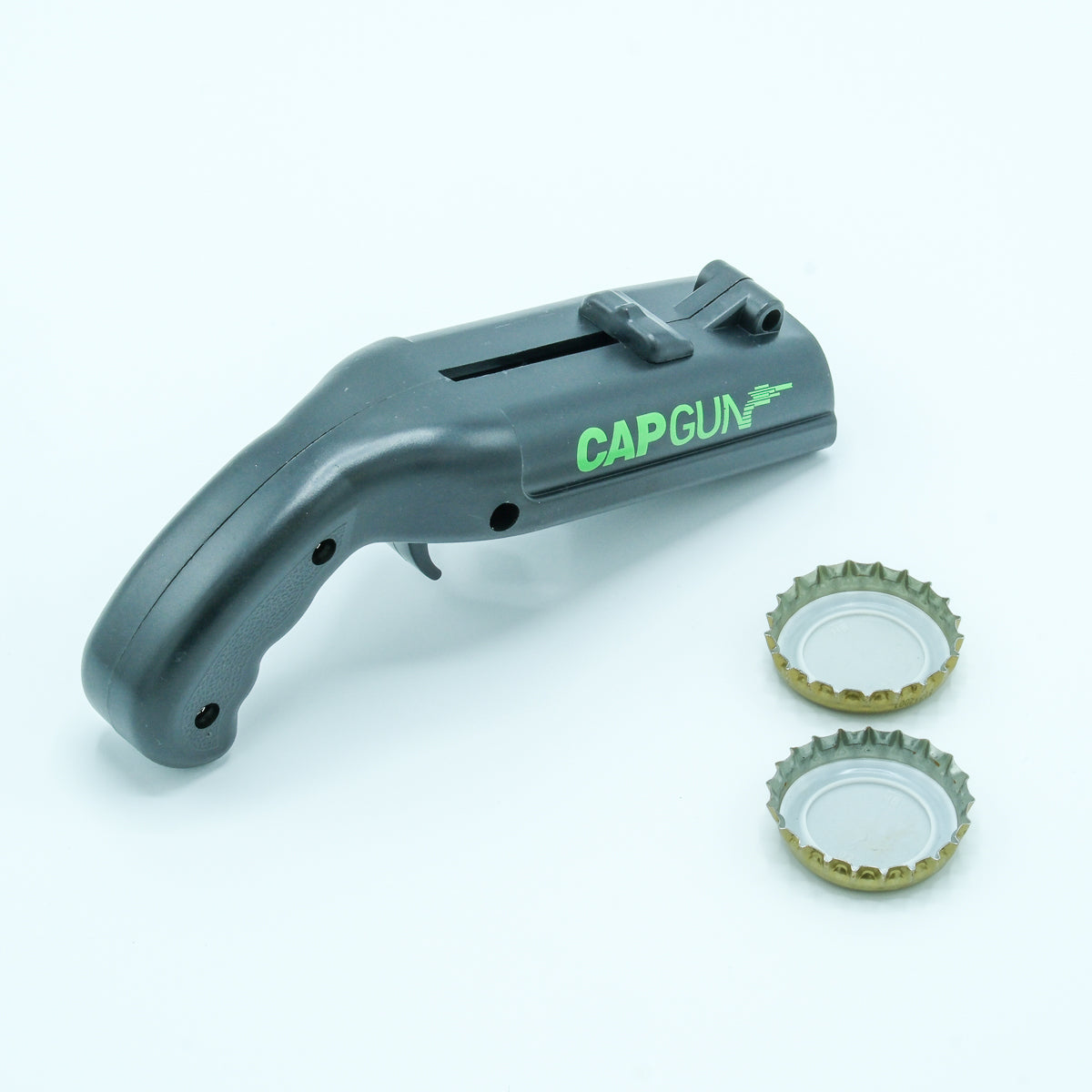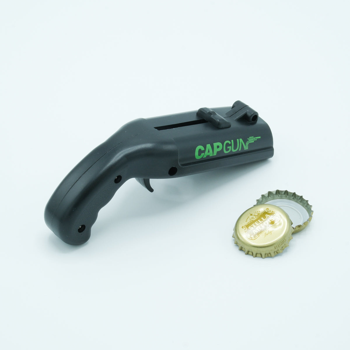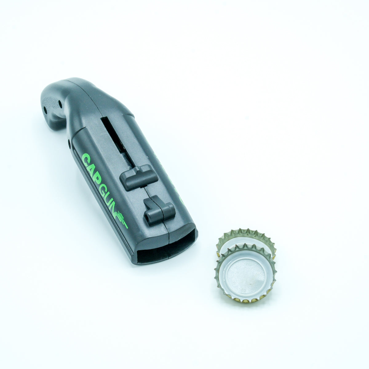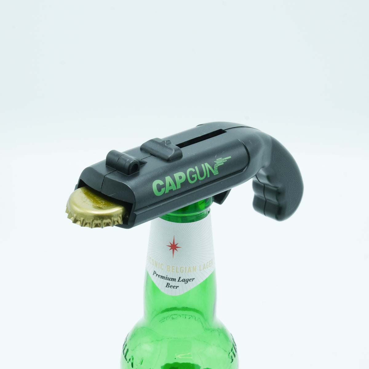Met de de capgun kun jij je flesje openmaken en het dopje meteen wegschieten.
