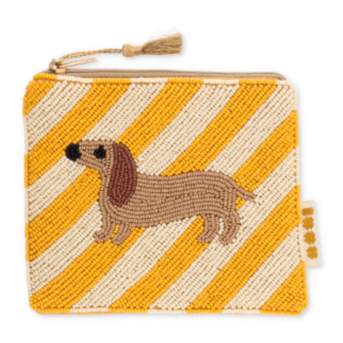 Op zoek naar een prachtige eyecatcher voor in je tas? Deze handgemaakte etui met teckel-motief steelt gegarandeerd de show! De voorzijde is rijkelijk versierd met glaskralen en heeft een vrolijk strepenpatroon in geel en crème. Het schattige teckelontwerp geeft de etui een speelse, stijlvolle touch.