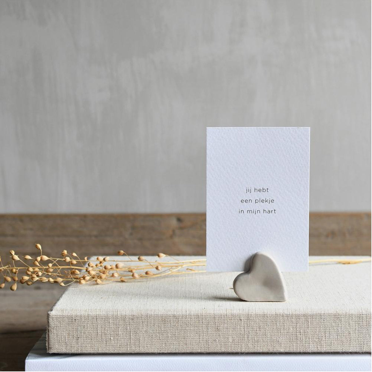 Mooie hartvormige kaarthouder met fijne wenskaart met tekst 'een plekje in mijn hart'.