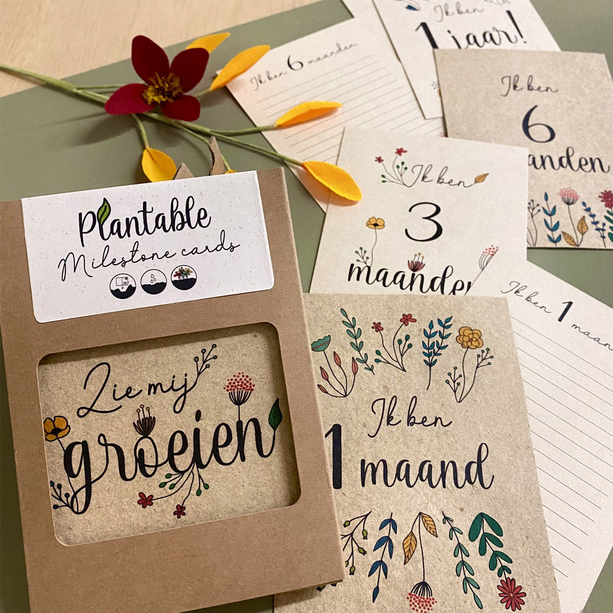 Deze cadeauset bevat 12 kaarten, 4 plantbare en 7 eco-kaarten (van landbouwafval), van geboorte tot het eerste jaar. Verpakt in een mooi, duurzaam cadeaudoosje.