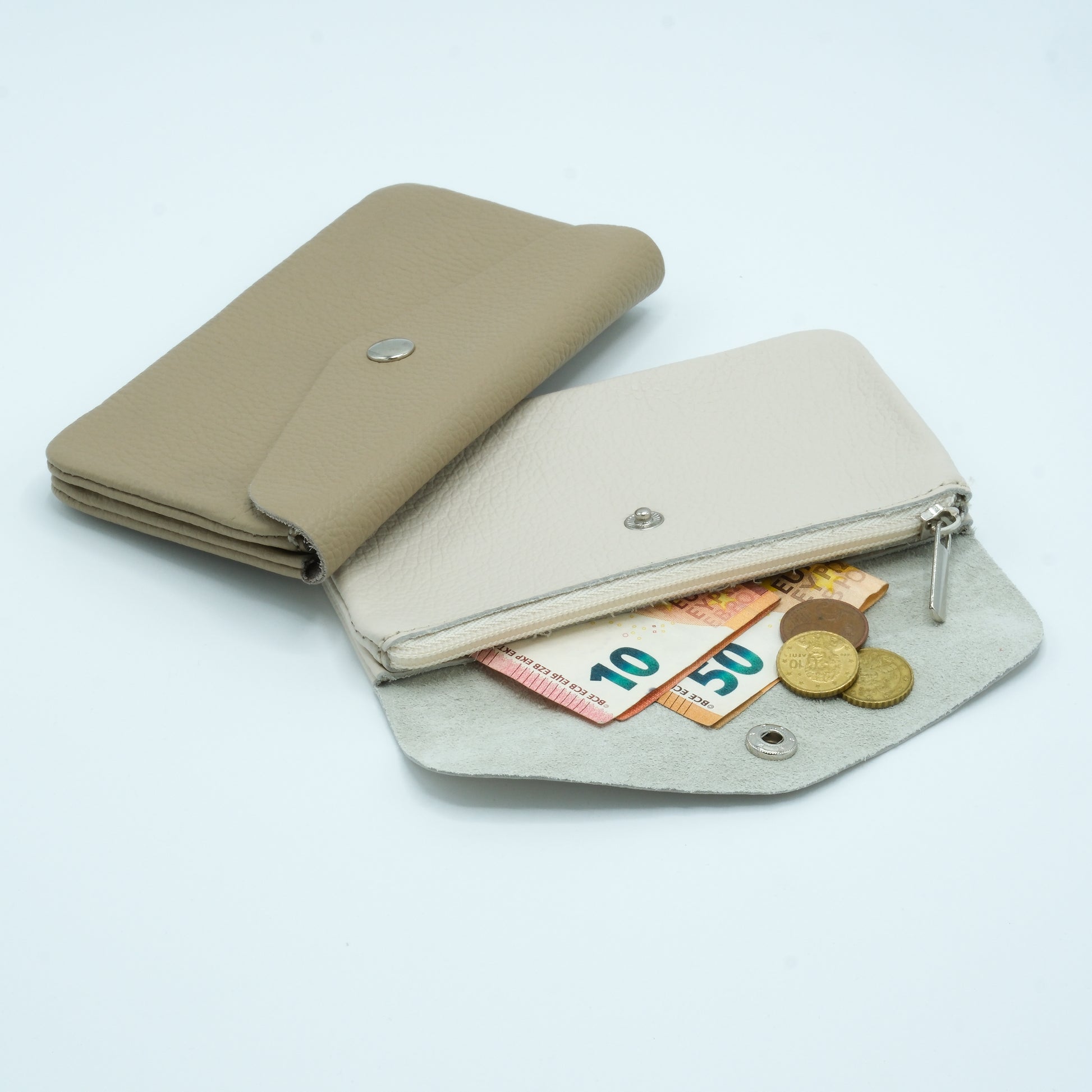 Deze leuke portemonnee beschikt over twee compartimenten met een apart gedeelte voor muntstukken dat afgesloten wordt met een rits.